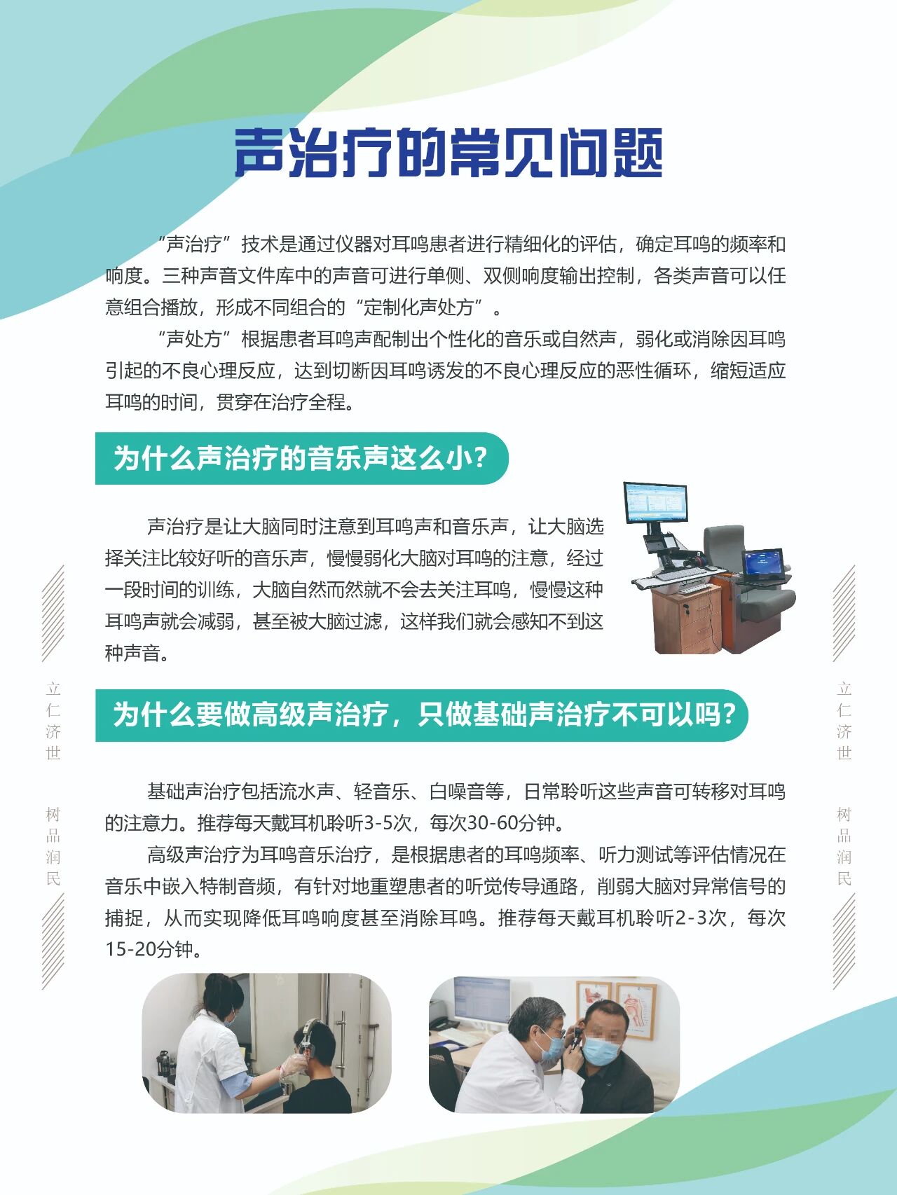 “声处方”根据患者耳鸣声配制出个性化的音乐或自然声,弱化或消除因耳鸣引起的不良心理反应,达到切断因耳鸣诱发的不良心理反应的恶性循环,缩短适应耳鸣的时间,贯穿在治疗全程。